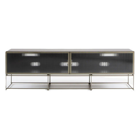 This ensemble of display units could resemble a geometric spatial occupation challenge between the body of the chest which is at once solid and diaphanous, and the thin mesh which streamlines the perimeter of its flat surfaces and is seen as an extension of the carcase. A provocative note somewhere between the essential industrial Bauhaus elements and contemporary elegance is struck through metallic finishes. The colours, reflected evanescently by the striped glazed panels, fade progressively to the point of disappearance, producing optical abstractions. An impression of segmented, repetitively rhythmed geometric figures, emphasised by the lacquered surfaces and wood panels to the rear, appears poetically, like a curtain which discreetly heralds the interior.